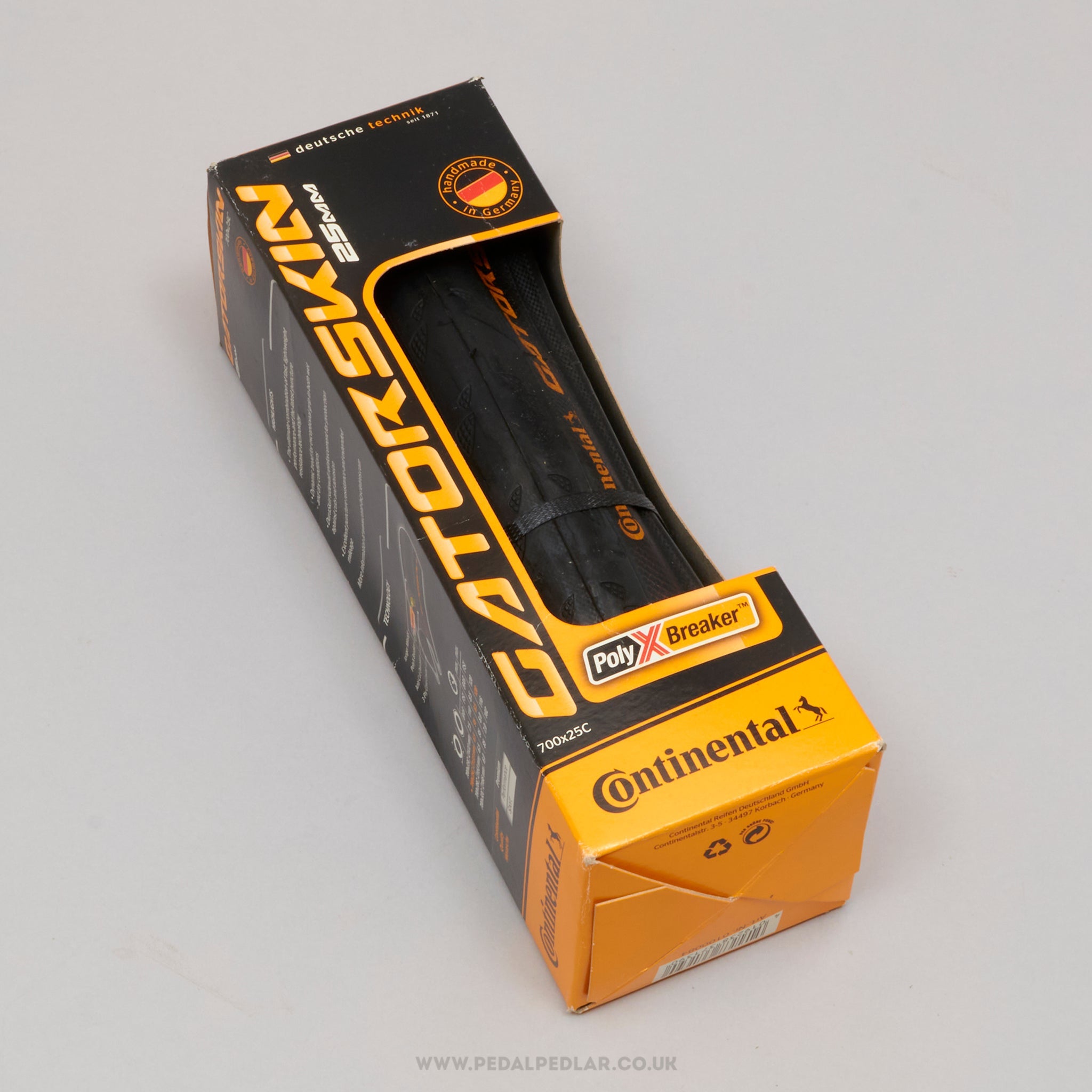 Continental Grand Prix folding tyres, hailing from Germany and in production during the 2010s. Made from rubber and weighing in at 440 grams (the weight and price displayed are for a pair of tyres). A fine choice for keeping your bike authentic, but also great for any other compatible bike.
