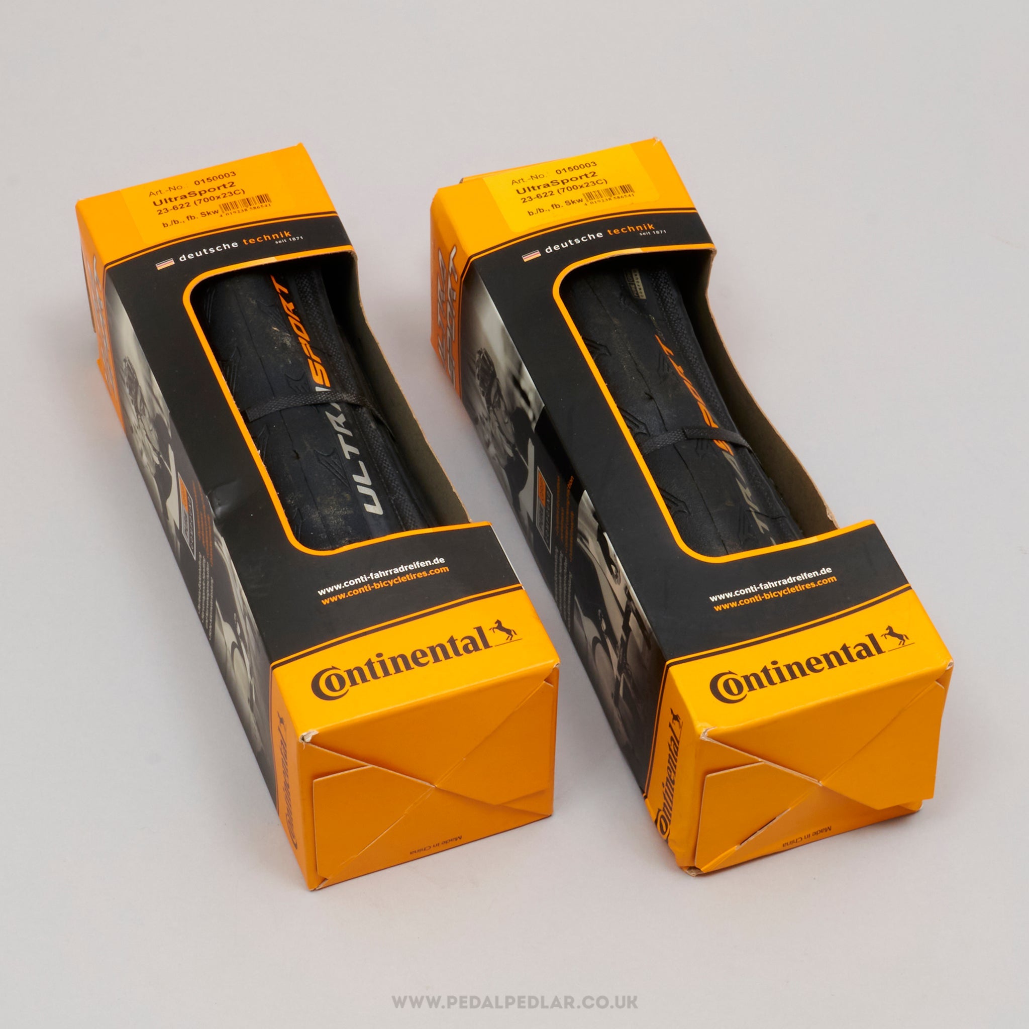 Continental Ultra Sport II folding tyres, hailing from Germany and in production during the 2010s. Made from rubber and weighing in at 663 grams (the weight and price displayed are for a pair of tyres). A fine choice for keeping your bike authentic, but also great for any other compatible bike.