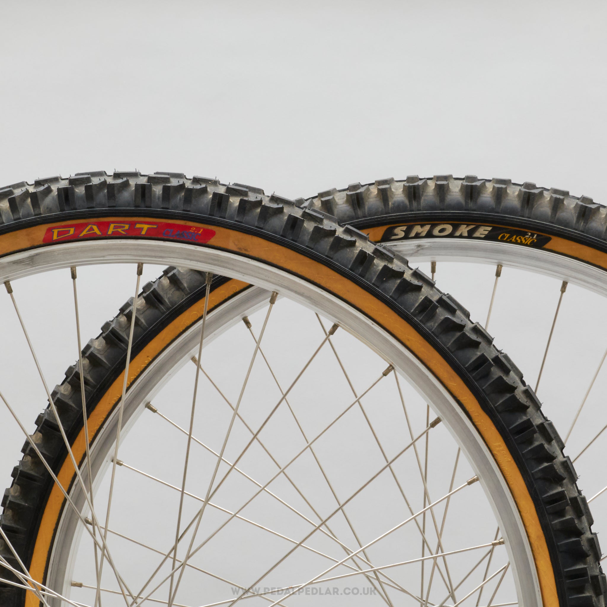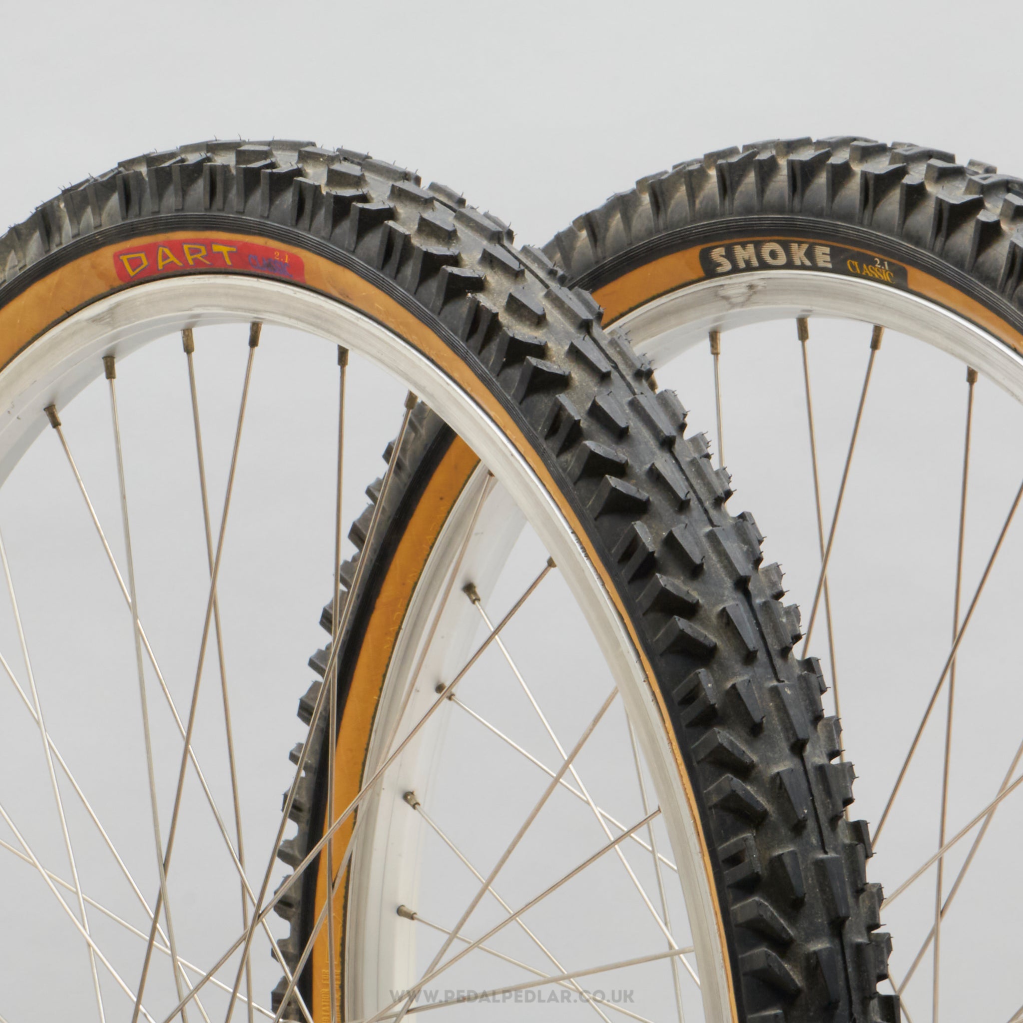 Panaracer Dart / Smoke folding tyres, hailing from Japan and in production during the 2010s. Made from rubber and weighing in at 1250 grams (the weight and price displayed are for a pair of tyres). A fine choice for keeping your bike authentic, but also great for any other compatible bike.
