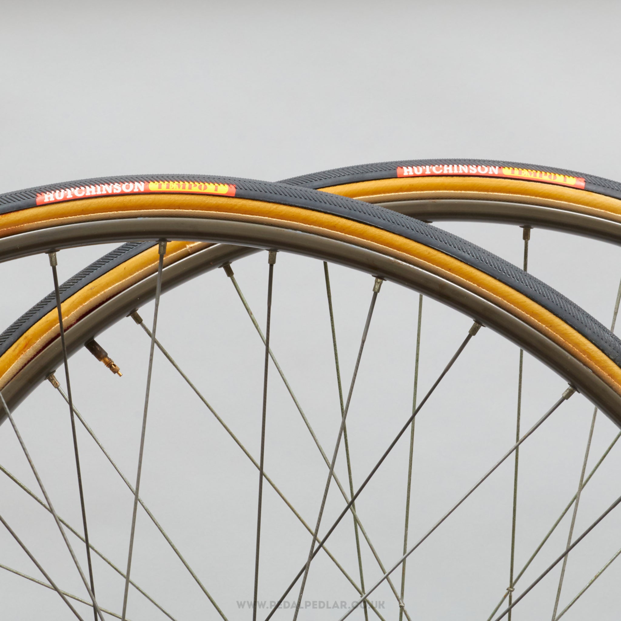 Hutchinson Tempo 1 tubular/sprint tyres, hailing from Italy and in production from the 1990s to the 2000s (yet still new & unused after all this time). Made from rubber and weighing in at 590 grams (the weight and price displayed are for a pair of tyres). A fine choice for keeping your classic bike authentic, but also great for any other compatible bike.