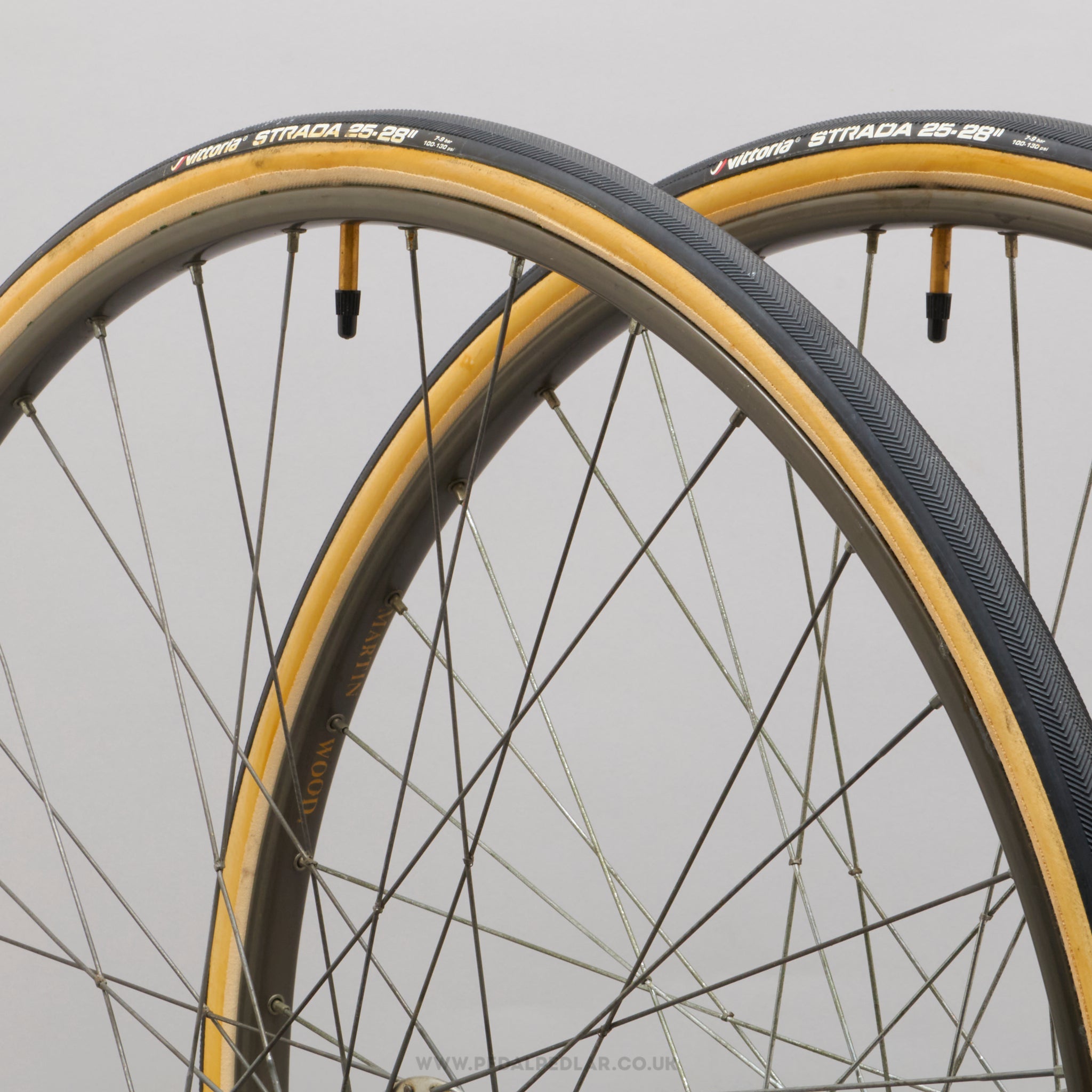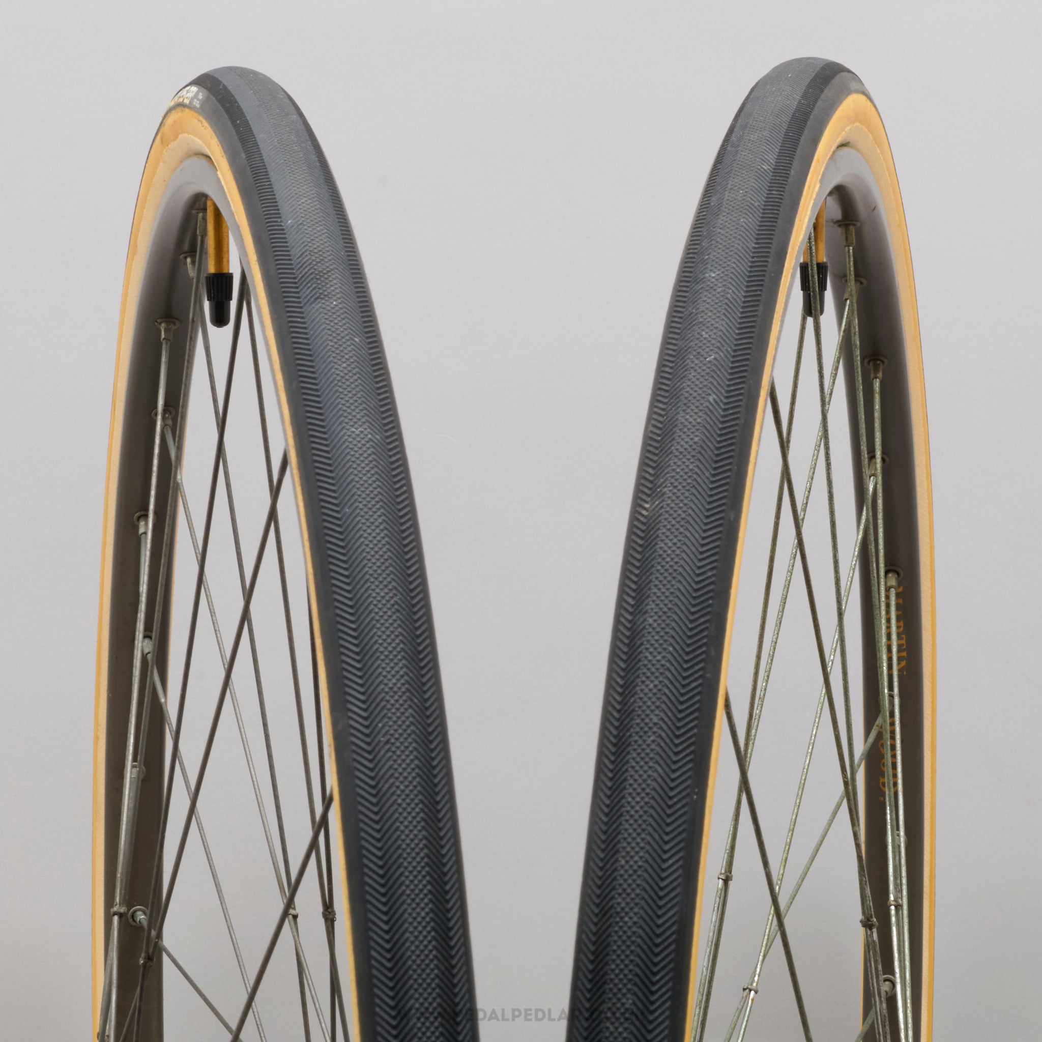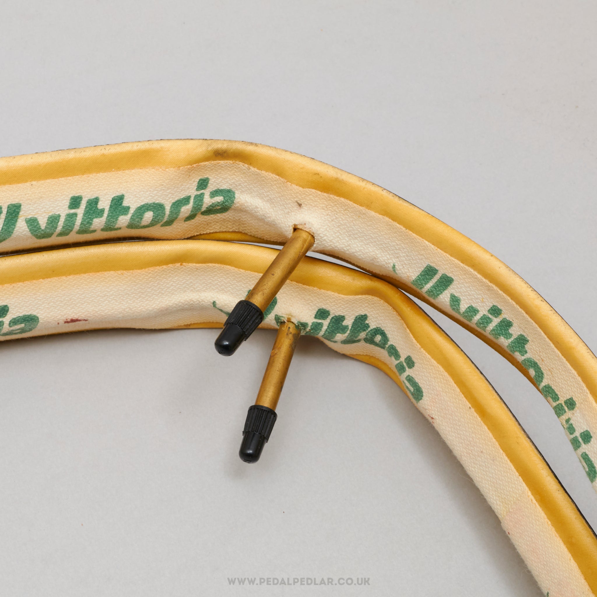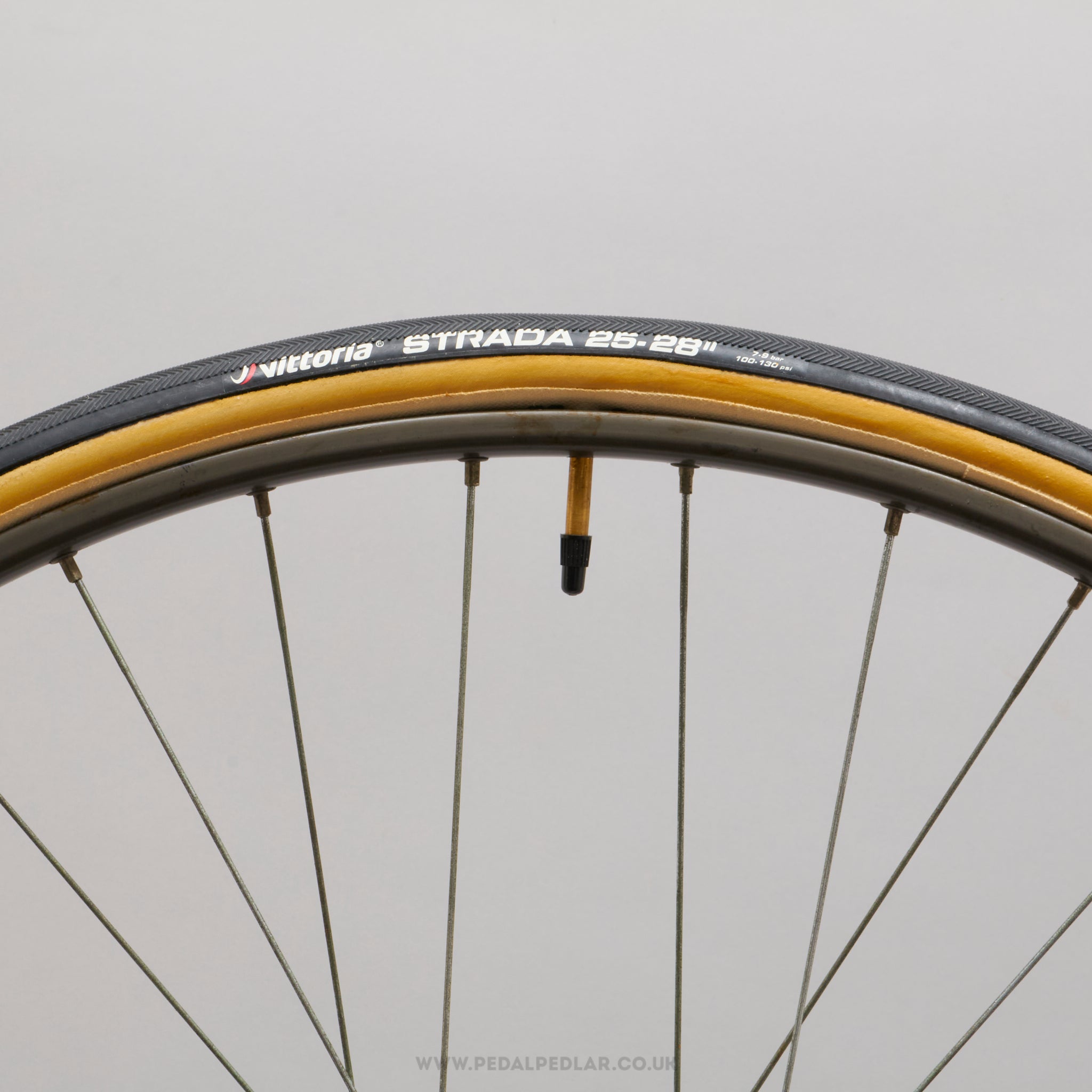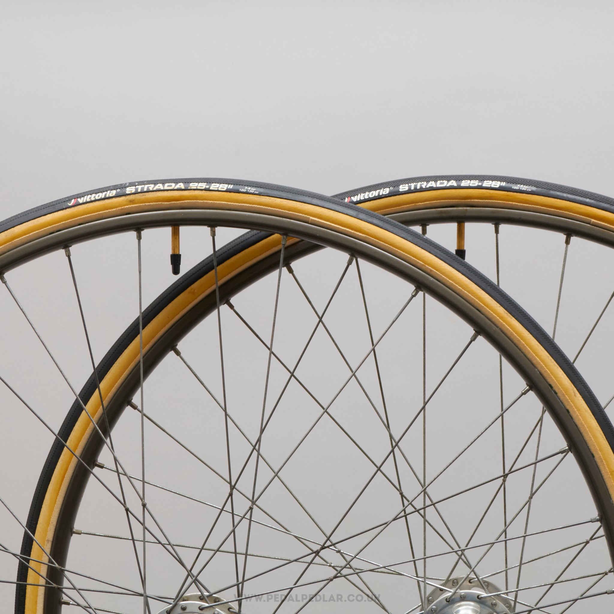 Vittoria Strada tubular/sprint tyres, hailing from Italy and in production during the 2000s. Made from rubber and weighing in at 645 grams (the weight and price displayed are for a pair of tyres). A fine choice for keeping your classic bike authentic, but also great for any other compatible bike.
