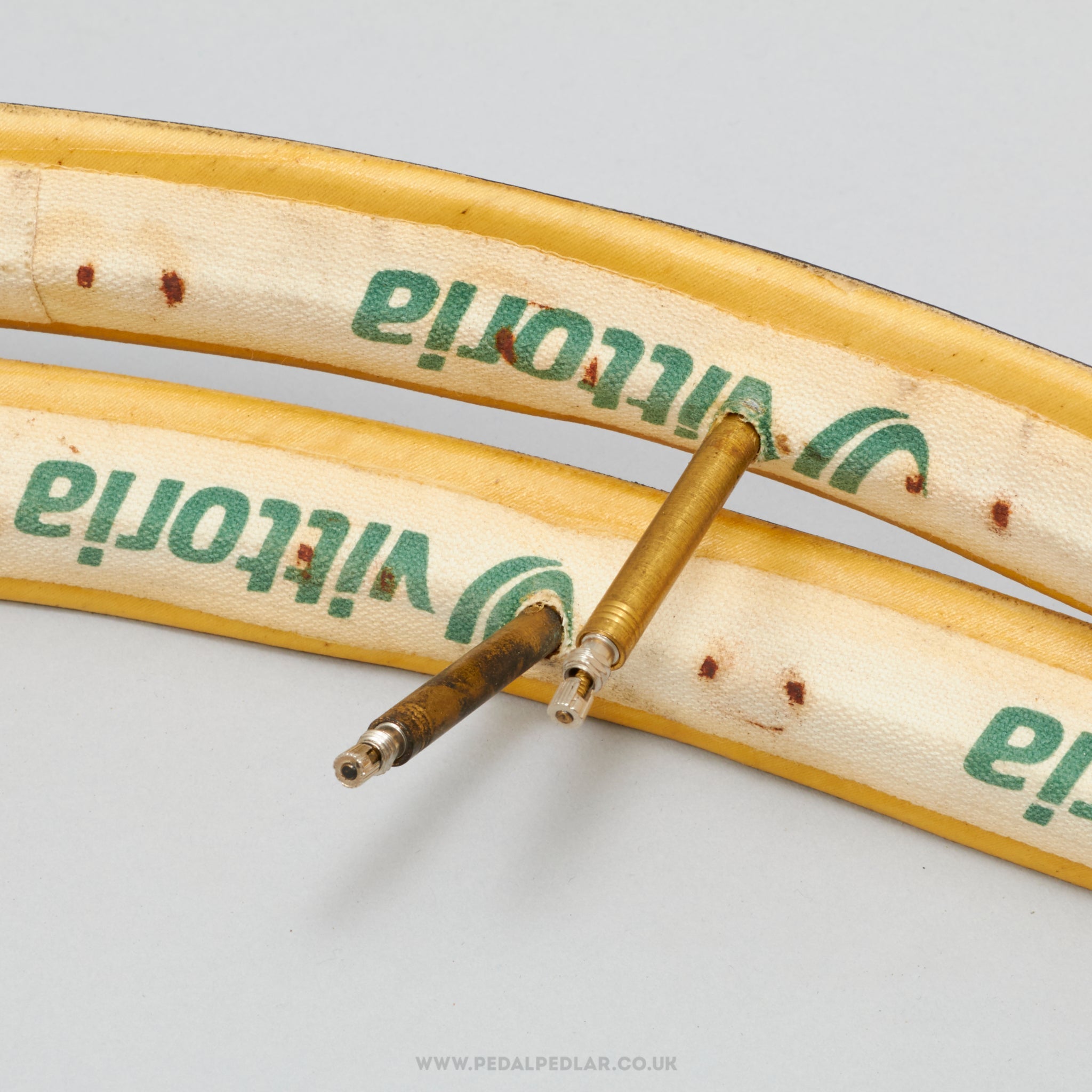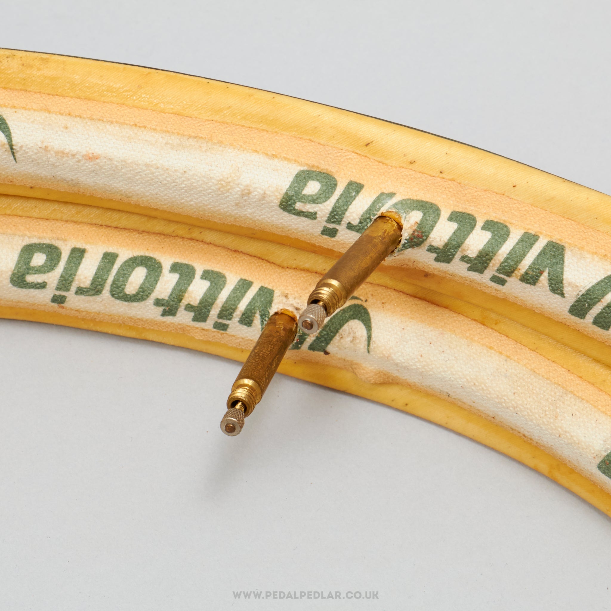 Vittoria Pro-Team Tecno Twin Tread folding tyres, hailing from Italy and in production during the 1990s (yet still new & unused after all this time!). Made from rubber/kevlar and weighing in at 466 grams (the weight and price displayed are for a pair of tyres). A fine choice for keeping your classic bike authentic, but also great for any other compatible bike.
