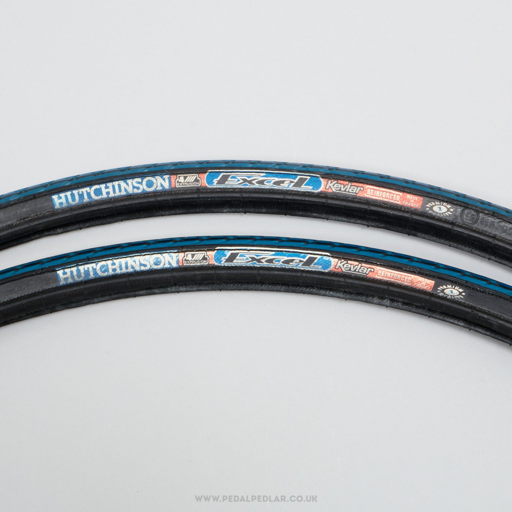 Hutchinson Excel tyres, hailing from France and in production during the 1990s (yet still new & unused after all this time!). Made from rubber/kevlar and weighing in at 624 grams (the weight and price displayed are for a pair of tyres). A fine choice for keeping your classic bike authentic, but also great for any other compatible bike.