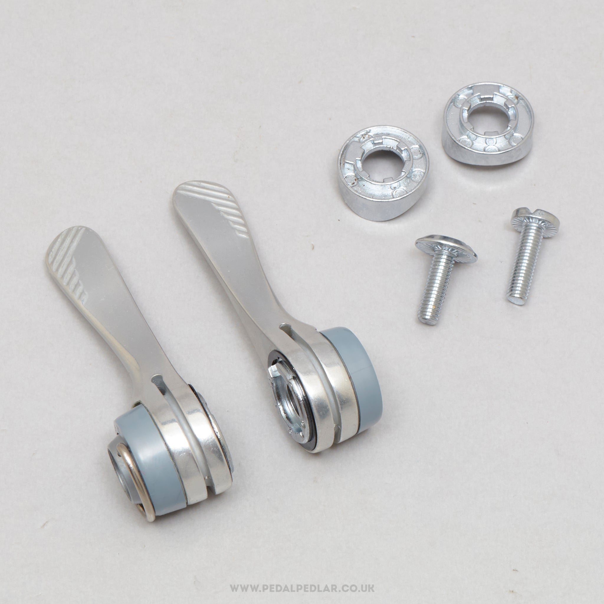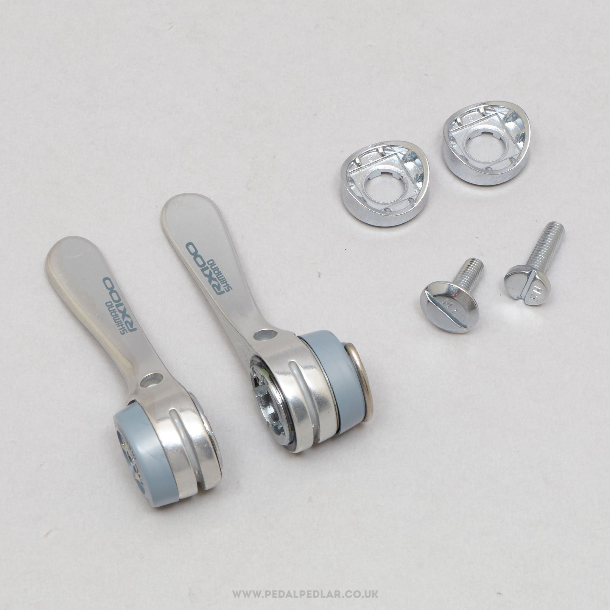 Shimano RX100 down tube shifters (or gear levers if you prefer), hailing from Japan and in production during the 1990s (yet still new & unused after all this time). Made from aluminium/plastic and weighing in at 75 grams. A fine choice for keeping your classic bike authentic, but also great for any other compatible bike.