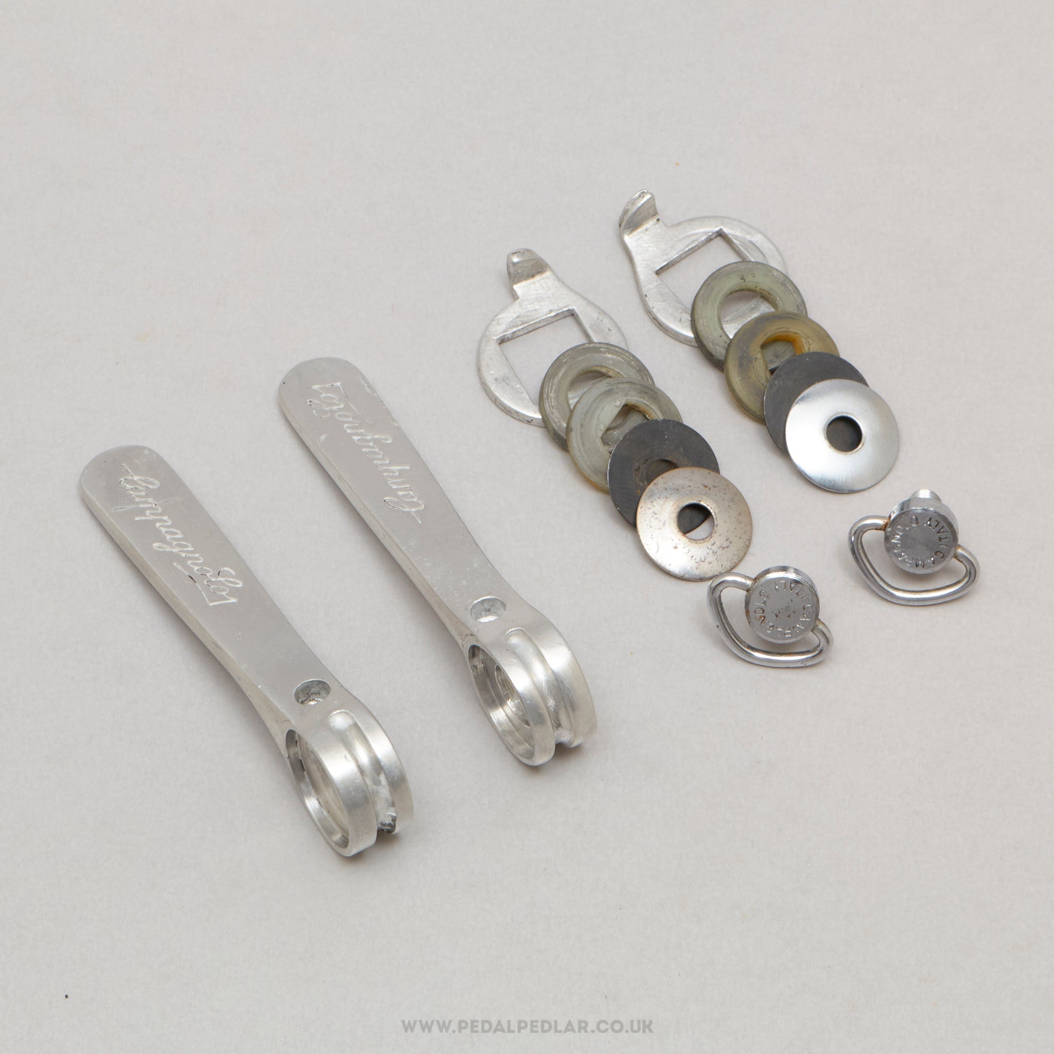 Campagnolo Nuovo/Super Record down tube shifters (or gear levers if you prefer), hailing from Italy and in production during the 1980s. Made from aluminium/steel and weighing in at 66 grams. A fine choice for keeping your vintage bike authentic, but also great for any other compatible bike.