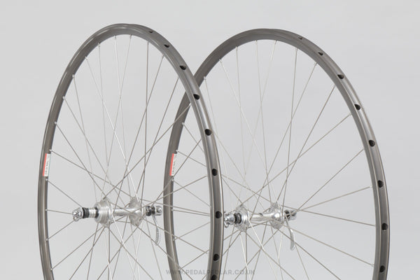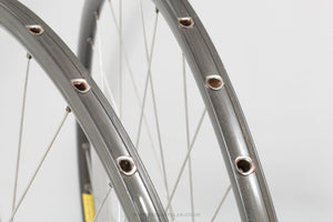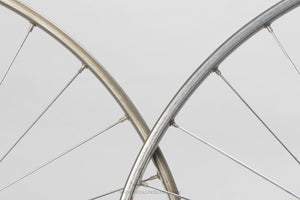 Campagnolo Nuovo/Super Record wheels built with Mavic Monthlery Pro rims, the hubs hailing from Italy and in production during the 1980s. Made from aluminium/steel and weighing in at 1.9 kg - pretty lightweight for a pair of wheels at that time. A fine choice for keeping your vintage bike authentic, but also great for any other compatible bike too.