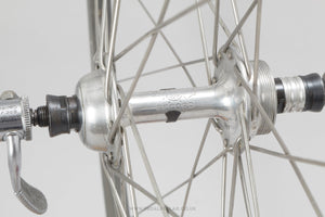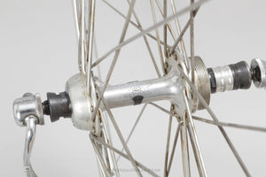 Campagnolo Nuovo Tipo / Gran Sport wheels built with Mavic Monthlery Pro rims, the hubs hailing from Italy and in production during the 1970s. Made from aluminium/steel and weighing in at 1.8 kg - incredibly lightweight for a pair of wheels at that time. A fine choice for keeping your vintage bike authentic, but also great for any other compatible bike too.
